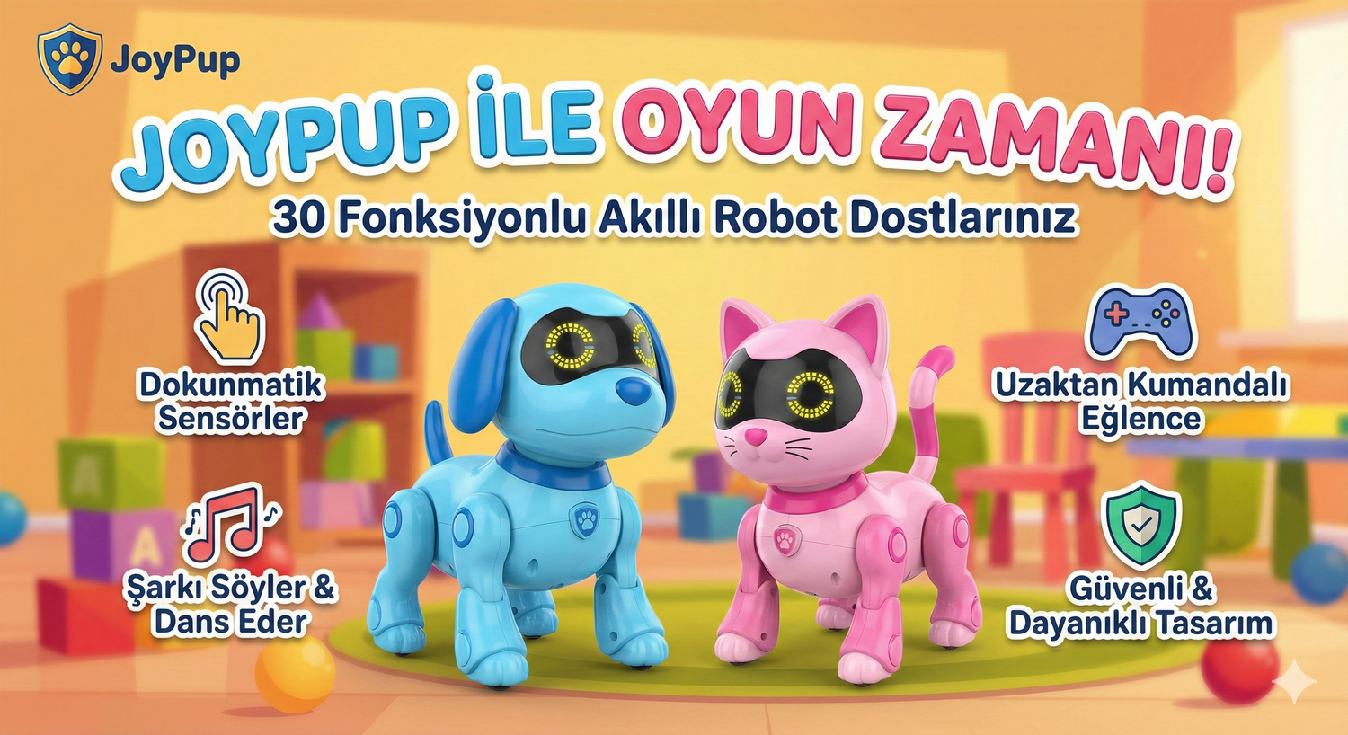 Endişelenmeyin! JoyPup, çocukların hareketli dünyasına uyum sağlamak için **darbelere dayanıklı, yüksek kaliteli ABS plastikten** üretilmiştir. Düşmelere ve çarpmalara karşı ekstra güçlendirilmiş gövdeye sahiptir.